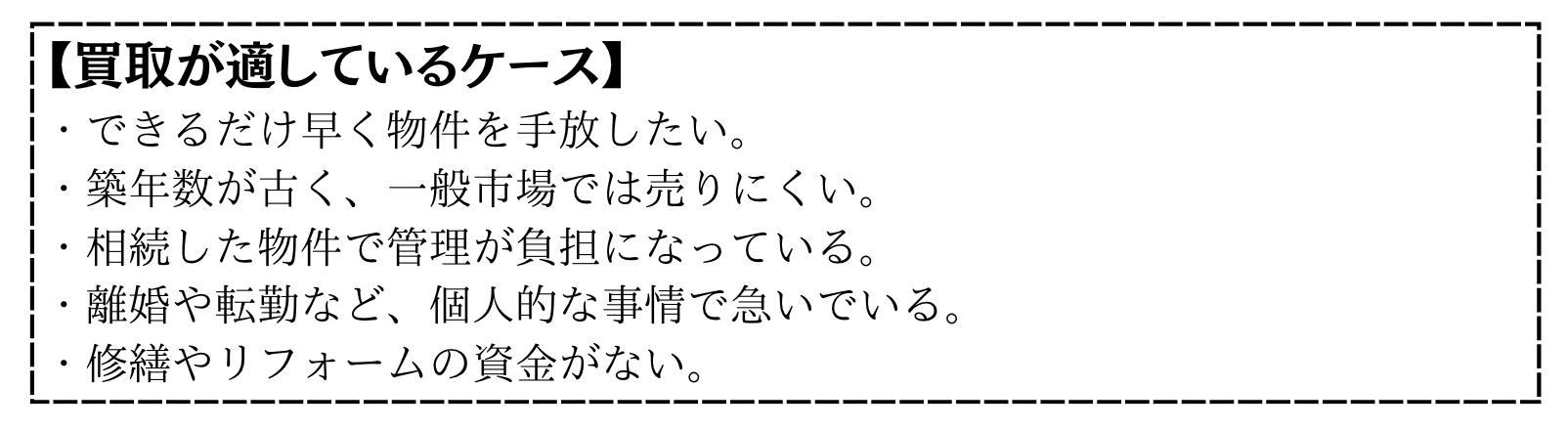 一般的な仲介売却とは異なり、短期間で確実に現金化できる点が最大の特徴です。